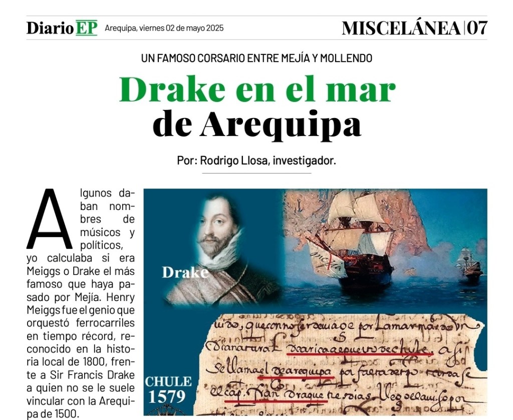 Artículo: Drake en el mar de Arequipa, por Rodrigo Llosa, Diario EP, Viernes 2 Mayo 2025, página 7