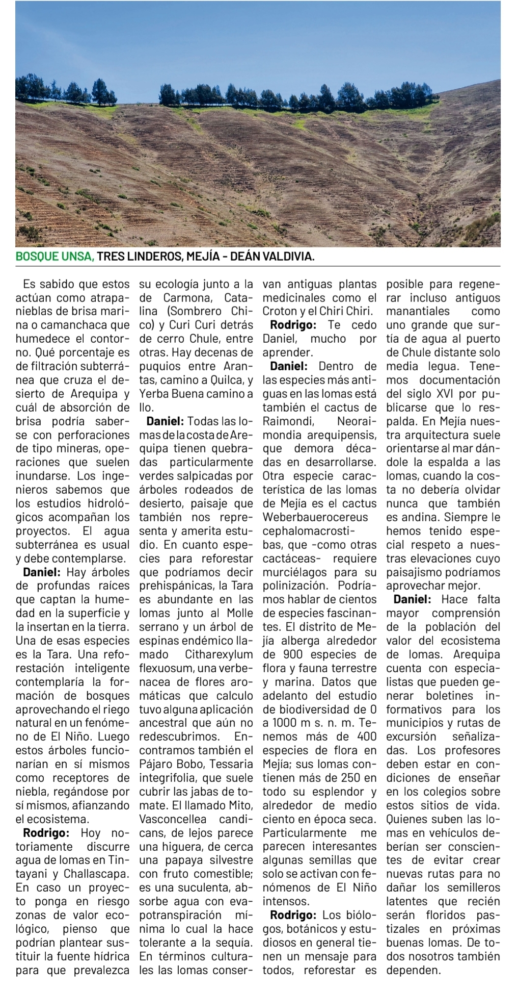 Daniel: La percepción es dependiente de fenómenos fuertes como el de El Niño. Si bien las buenas lomas no son predecibles, suelen tener una variabilidad que estudiamos y que cumple ciclos biológicos con especies vegetales únicas relevantes en el desarrollo de insectos, aves y fauna en general. Si uno observa un cactus de lomas encuentra líquenes que ayudan a recolectar humedad, si uno escarba la raíz, halla microorganismos. El aparente desierto arequipeño da cátedra en el uso eficiente del agua.