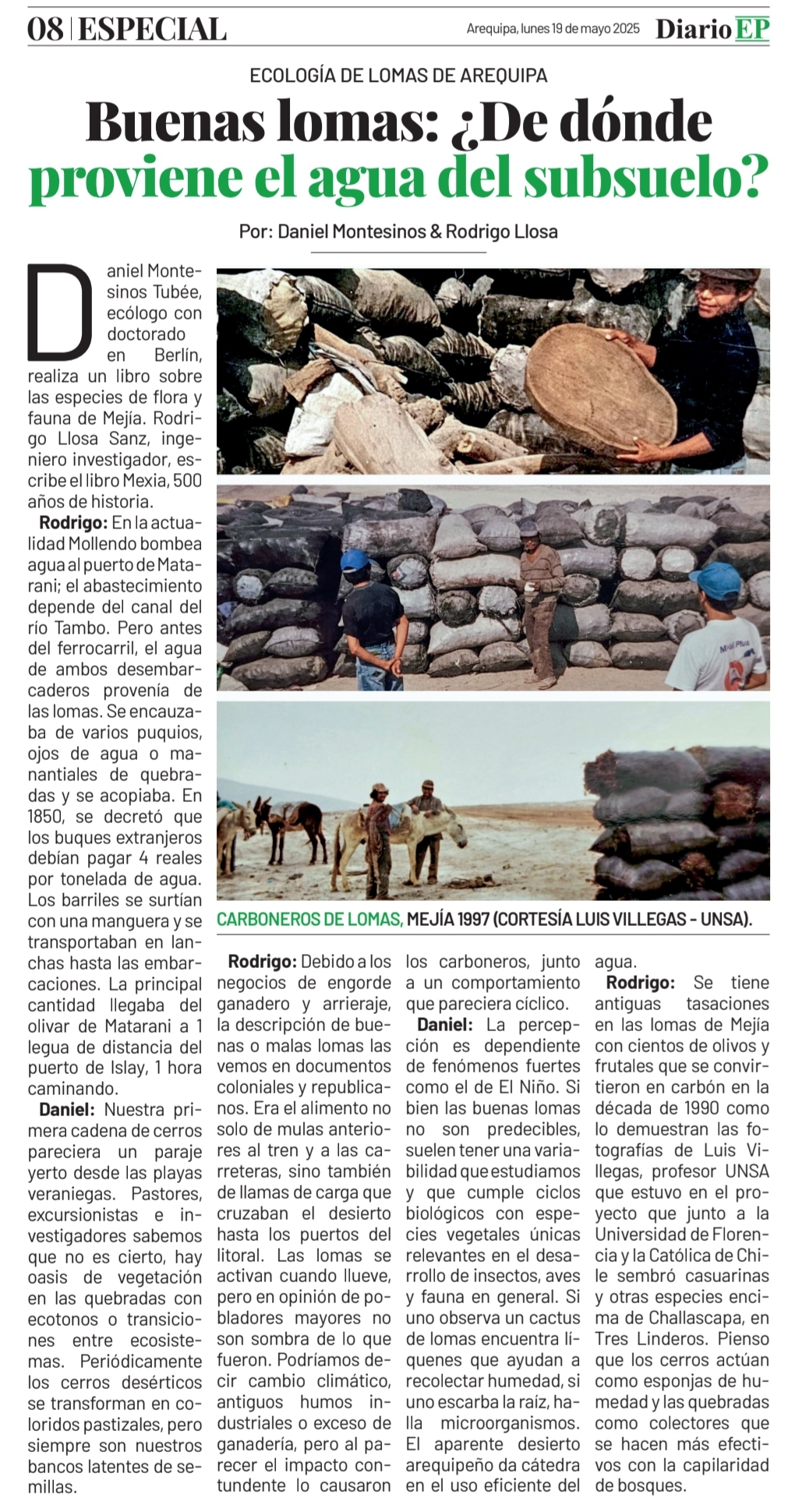 Artículo: Buenas lomas: ¿De dónde proviene el agua del subsuelo? por Daniel Montesinos & Rodrigo Llosa, Diario EP, Arequipa, Lunes 19 Mayo 2025