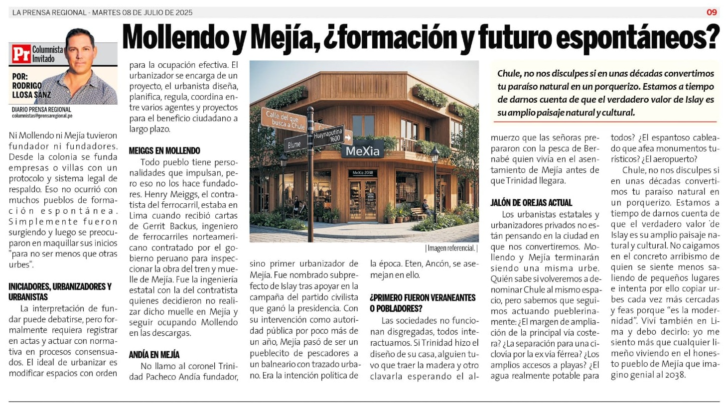 Artículo: Mollendo y Mejía: ¿formación y futuro espontáneos?, por Rodrigo Llosa, Diario Prensa Regional, Martes 8 Julio 2025, página 9