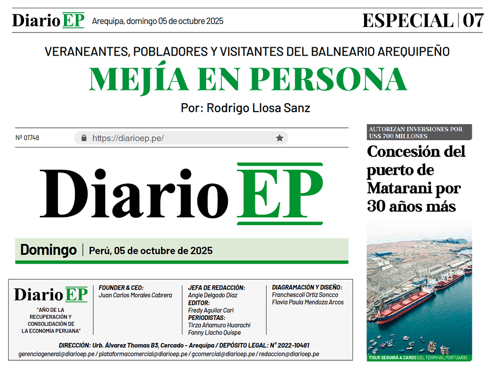 Artículo: MEJÍA EN PERSONA, veraneantes, pobladores y visitantes del balneario arequipeño, por Rodrigo Llosa Sanz, Diario EP, Arequipa, Especial Domingo 5 Octubre 2025, p. 7 – 8