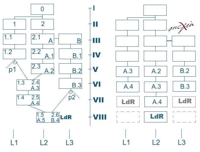 Estado 1: al subir a tope las poleas p1 y p2, la madre ocupa L2-IV. Entonces X puede verse simultáneamente en L2-V y L3-III. Se logra que figurativamente X sea tío – sobrino de sí mismo. Estado 2: podemos configurar L2-V y L3-V de misma generación. Así X es también primo de sí.