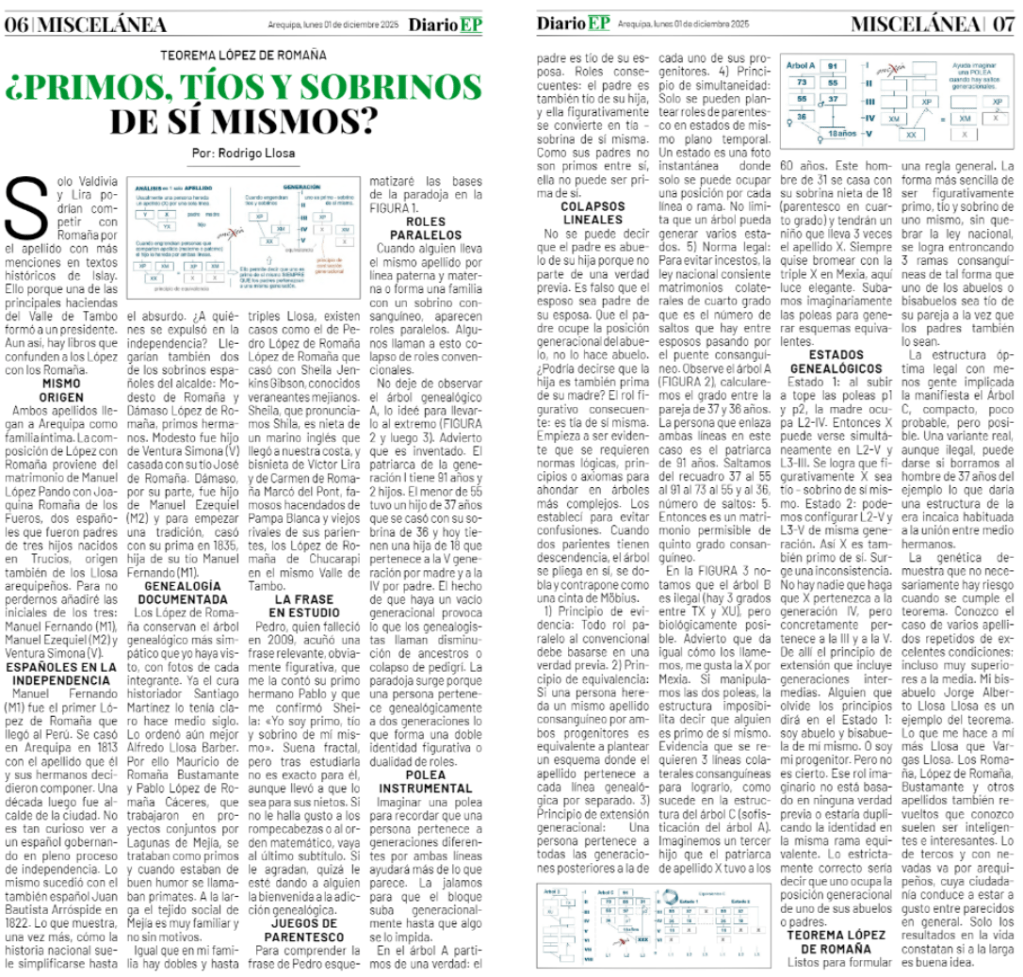 Artículo, Diario EP, Teorema López de Romaña ¿primos, tíos y sobrinos de sí mismos? Arequipa, Lunes Primero de Diciembre de 2025, páginas 6 y 7
