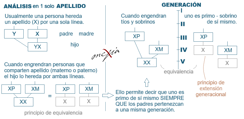1) Principio de evidencia: Todo rol paralelo al convencional debe basarse en una verdad previa. 2) Principio de equivalencia: Si una persona hereda un mismo apellido consanguíneo por ambos progenitores es equivalente a plantear un esquema donde el apellido pertenece a cada línea genealógica por separado. 3) Principio de extensión generacional: Una persona pertenece a todas las generaciones posteriores a la de cada uno de sus progenitores, obviamente hasta la suya. 4) Principio de simultaneidad: Solo se pueden plantear roles de parentesco en estados de mismo plano temporal. Un estado es una foto instantánea donde solo se puede ocupar una posición por cada línea o rama. No limita que un árbol pueda generar varios estados. 5) Norma legal: Para evitar incestos, la ley nacional consiente matrimonios colaterales de cuarto grado que es el número de saltos que hay entre esposos pasando por el puente consanguíneo. Observe el árbol A de nuevo: