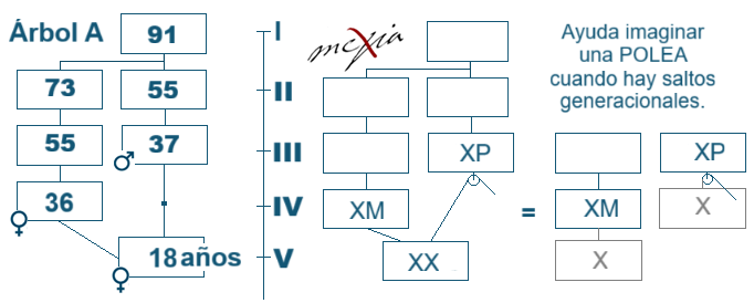 Imaginar una polea para recordar que una persona pertenece a generaciones diferentes por ambas líneas ayudará más de lo que parece. La jalamos para que el bloque suba generacionalmente hasta que algo se lo impida.