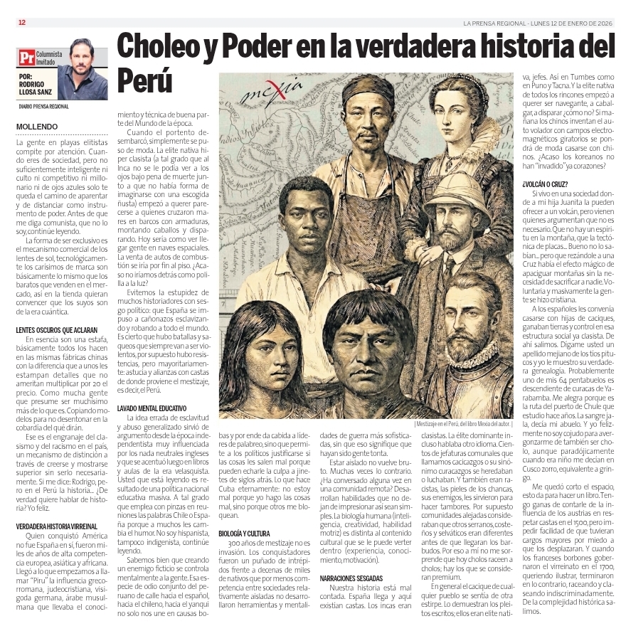 Artículo: Choleo y Poder en la verdadera historia del Perú, por Rodrigo Llosa, Diario Prensa Regional, Lunes 12 Enero 2026, página 12